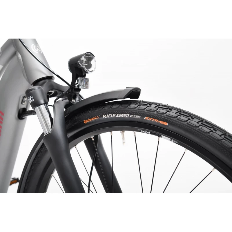 De robustes pneus Continental de 27,5 » et une fourche aluminium à suspension à l’avant vous permettront d’atteindre votre destination sereinement, même hors des sentiers battus.